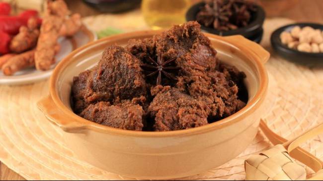 – Sajiannya yaitu rendang daging sapi seringkali kelihatan pada hari raya Idul Fitri.